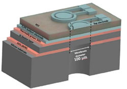 PMUTs generate ultrasound through vibration of a drum‑shaped thin‑film membrane consisting of a ~1 µm piezoelectric layer sandwiched between electrodes on a silicon membrane. Fabrication uses standard lithography and thin‑film processes, enabling mass production, miniaturization, high design complexity, and CMOS integration. Recent PMUT developments address previous technical limitations that restricted their use in medical ultrasound probes.